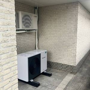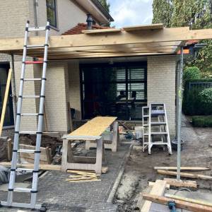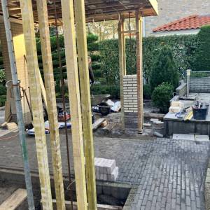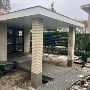 Inmiddels zijn de palen van de veranda gemetseld en is ook de dakbedekking aangebracht. Voor het verduurzamen van de woning is er een hybride warmtepomp van Vaillant geplaatst.