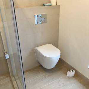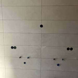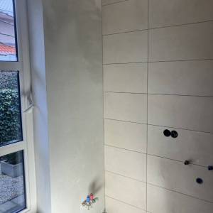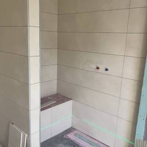 Inmiddels zijn we binnen begonnen aan het tegelwerk van de badkamer.
