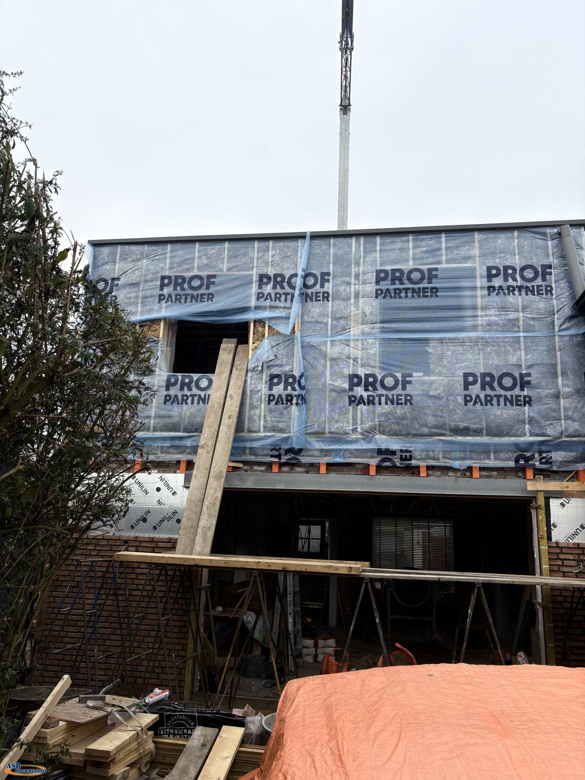 Inmiddels zijn er al veel werkzaamheden verricht in en rondom de woning. De aan en opbouw zijn inmiddels geheel opgetrokken en de opbouw staat gereed voor de dakdekker.